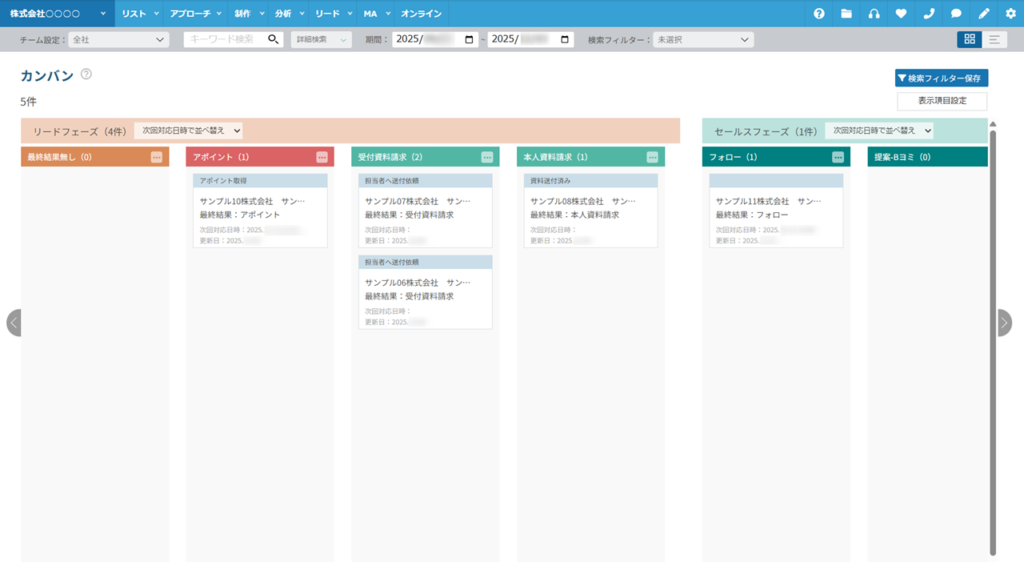 リードになった企業を、リード管理画面のカンバン表示で管理することができます。