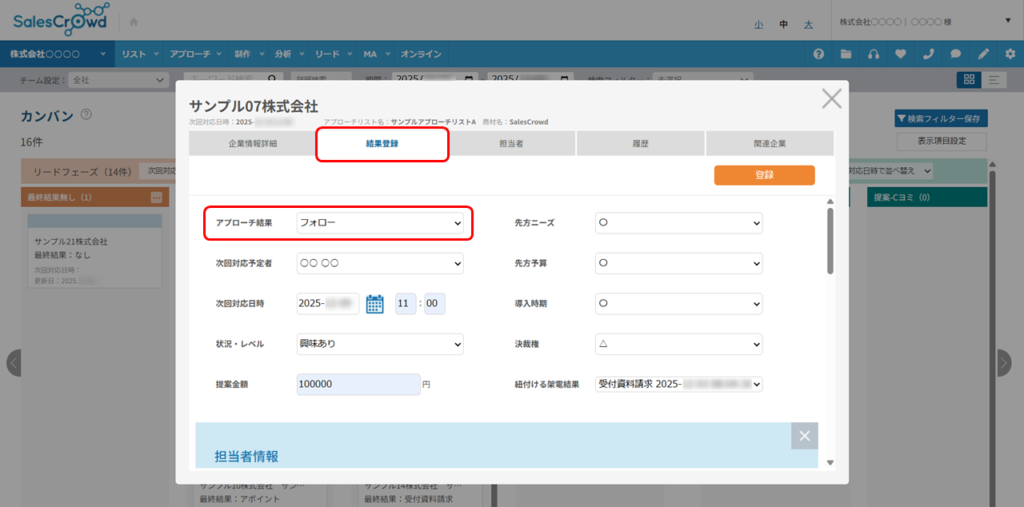 商談結果登録をする際の、商談アプローチ結果を追加する方法はこちらをご確認ください。
