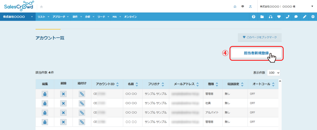 ④アカウント一覧で、「担当者新規登録」をクリックします。
