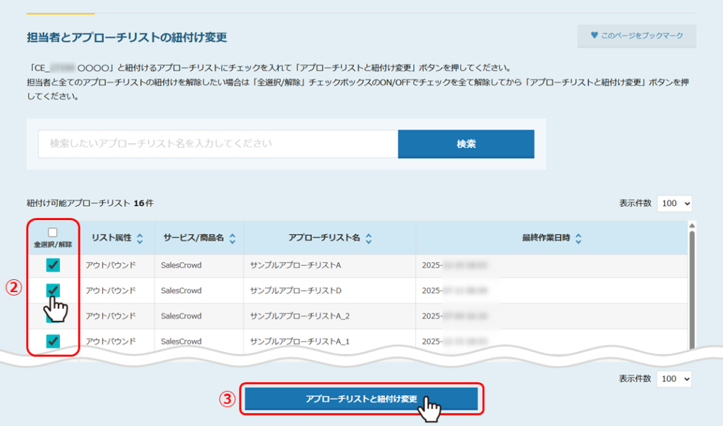 ②担当者とアプローチリストの紐付け変更画面で、紐付けたいアプローチリストにチェックを入れます。