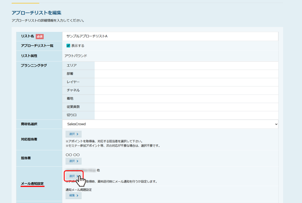 ③アプローチリスト編集画面で、メール通知設定項目の「選択」をクリックします。