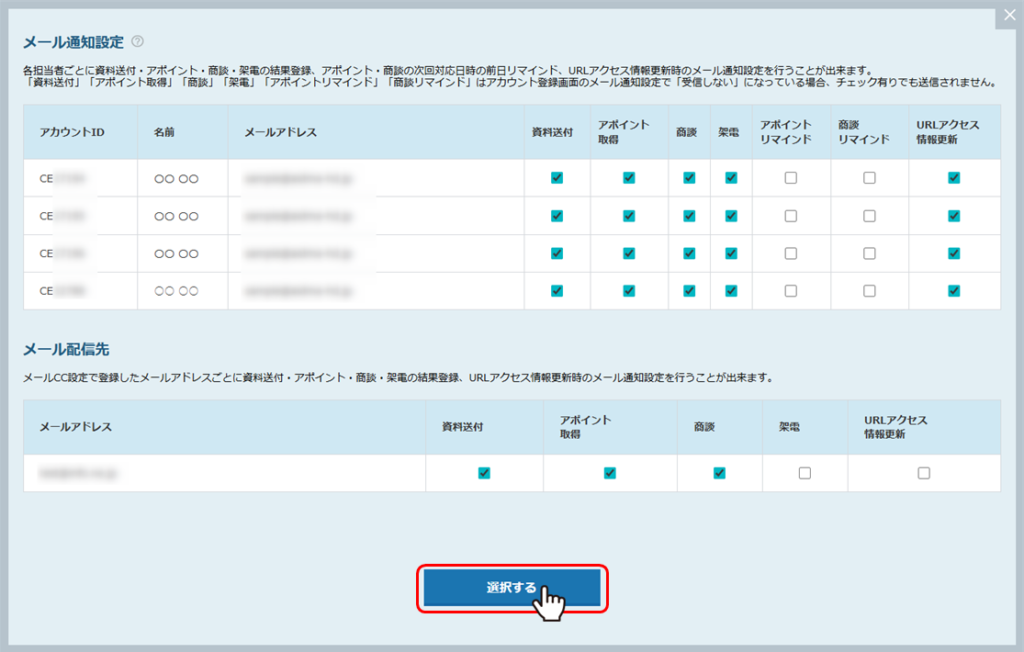 ⑤各宛先がどのアプローチ結果の通知を受け取るかチェックし、「選択する」をクリックして、設定を完了します。