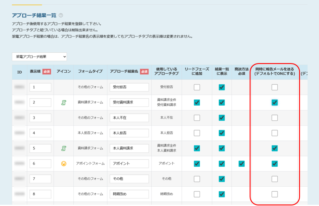 アプローチ結果一覧は、上部メニュー「アプローチ」から「アプローチ結果設定」→「アプローチ結果設定」をクリックして開き、同時に報告メールを送る項目のチェックボックスで設定します。